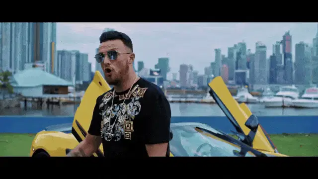 A hand with a ring and watch pokes a visibly sunburned stomach, eliciting an 'Ouch!' reaction.