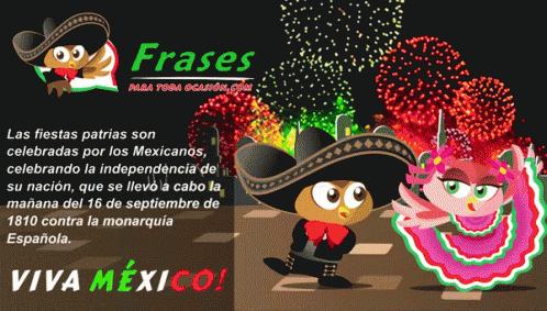 Animated owls celebrate Mexican Fiestas Patrias with fireworks, commemorating Mexico's independence from Spain.