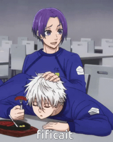 Reo Mikage playfully places a sausage on Seishiro Nagi's head as he rests, a lighthearted moment between the Blue Lock characters.