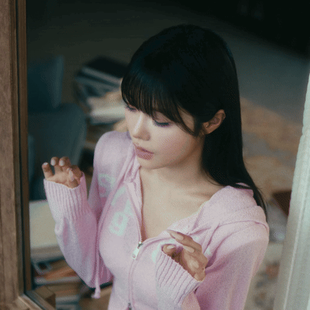 Keena from Fifty Fifty in a pink hoodie, looking curiously out a window.