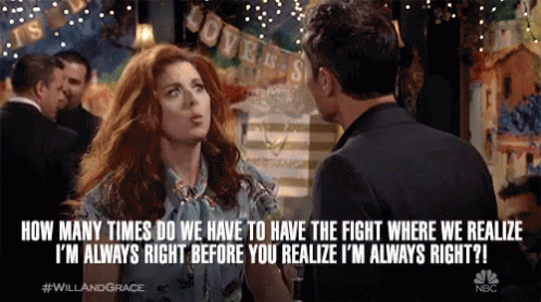 Grace Adler (Debra Messing) passionately argues, asking how many times they need to fight before realizing she's always right.