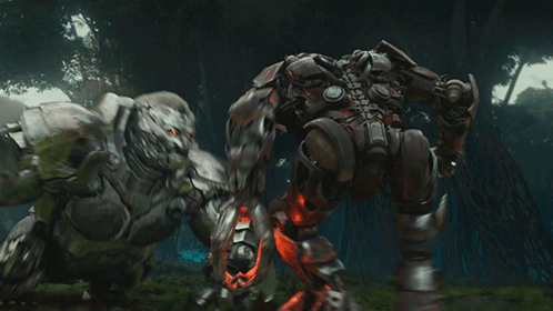 Apelinq and Scourge clash in an intense Transformers battle, with Apelinq performing a powerful jump attack.