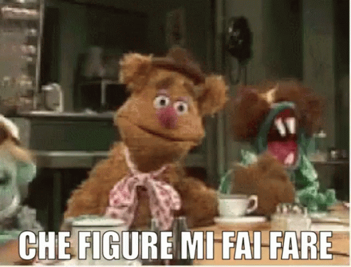 Two Muppet-like puppets at a table, one looking embarrassed, with the Italian phrase 'You're making me look bad' displayed.