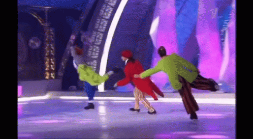 Averbukh and Yagudin perform as clowns on ice with friends, showcasing their figure skating skills.
