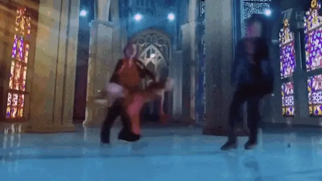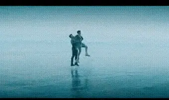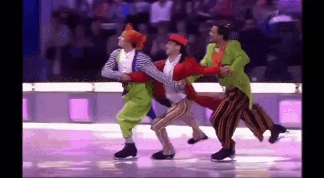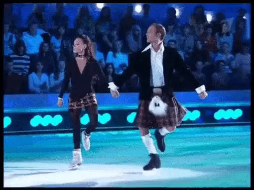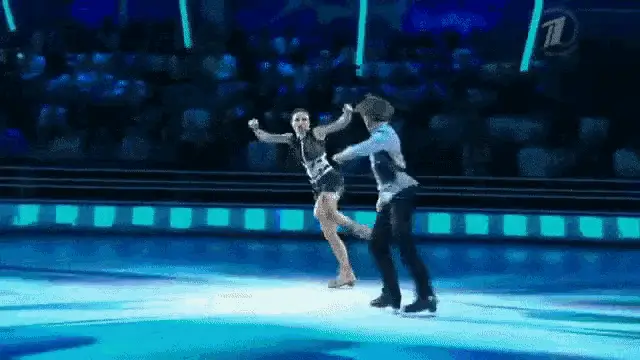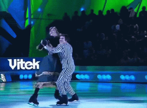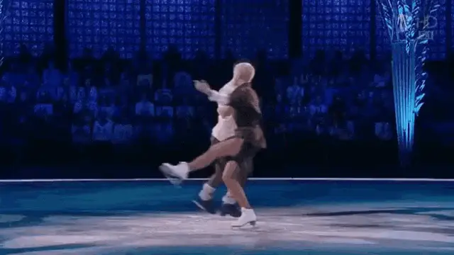 Chulpan Hamatova and Kostomarov ice skating, with Kostomarov carrying Hamatova in a striped suit.