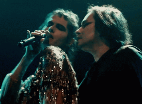 Filipe Catto sings passionately into a microphone while Johnny Hooker performs alongside, bathed in stage lights.