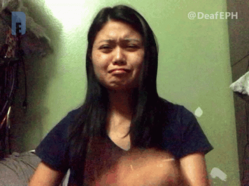 A Filipino Deaf woman crying and making a funny face, expressing emotion with Filipino Sign Language.