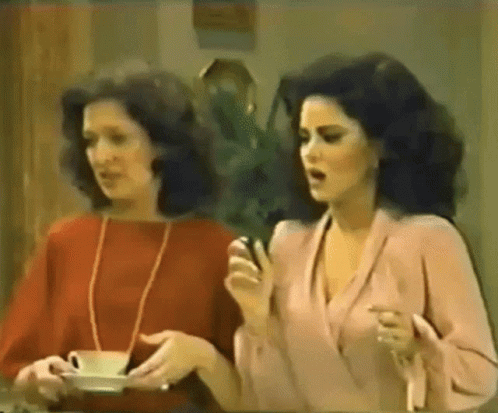 Delta Burke and Dixie Carter in a scene from Filthy Rich, with one reacting dramatically while the other holds a teacup.