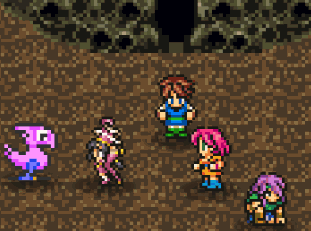 Pixelated characters Bartz, Elarra, Faris, Lenna, Tyro, and a Black Chocobo from Final Fantasy Record Keeper.