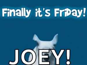 Joey the puppy joyfully jumps in the air, celebrating 'Finally it's Friday!' with enthusiasm.