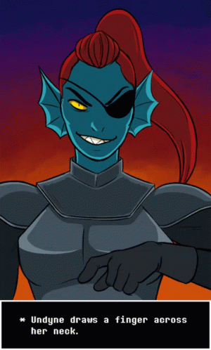 a cartoon drawing of a monster with the words " undyne draws a finger across her neck "