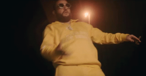 Ahmad Balshe in a yellow sweatshirt and sunglasses dancing, making a finger gun gesture towards his belly.