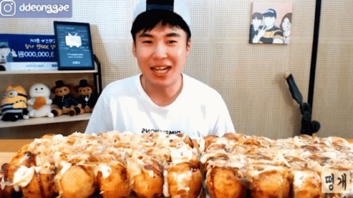 Ddeonggaeddeong presents a massive takoyaki mukbang, making a finger heart gesture for his viewers.