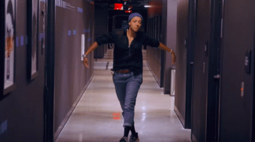 Fiona Nova dances energetically in a modern hallway, wearing a beanie and casual attire.