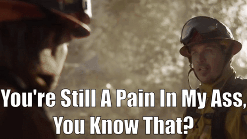 a man in a helmet talks to another man with the words you 're still a pain in my ass