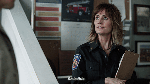 Sharon Leone (Diane Farr) from Fire Country, wearing a California Fire Department uniform and holding a clipboard, says 'So is this.'