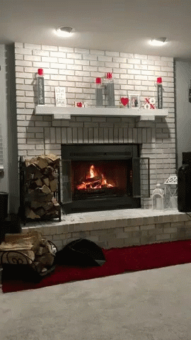 A warm and inviting living room features a white brick fireplace with a crackling fire, creating a cozy ambiance.