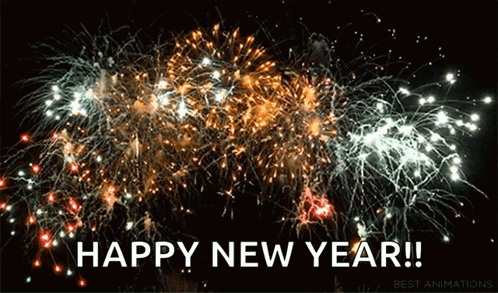 Spectacular fireworks light up the night sky, celebrating the New Year with a 'Happy New Year' message.