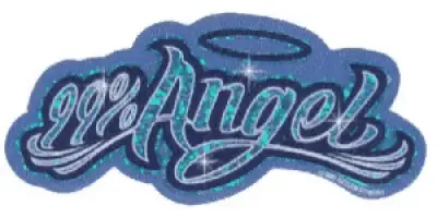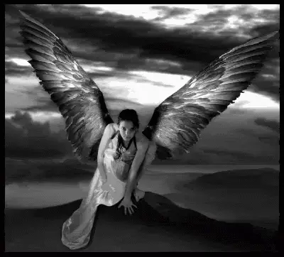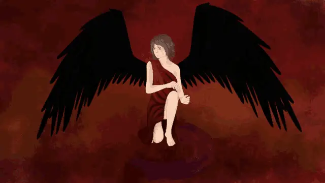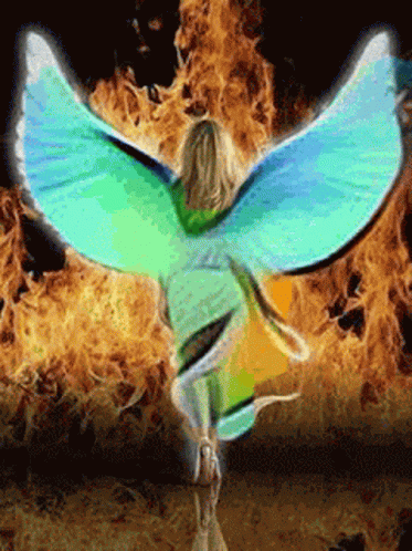An angel with vibrant blue and purple wings stands before a wall of intense flames.