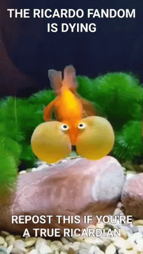 Funny Ricardo fish meme, urging true Ricardians to repost as the fandom is dying. Features a bubble-eyed goldfish.