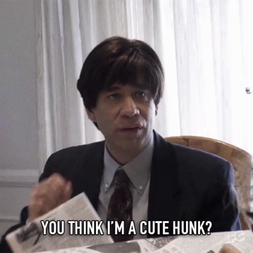 A man in a suit and wig asks, 'You think I'm a cute hunk?' from the 'Tell Me More' sketch on Documentary Now.