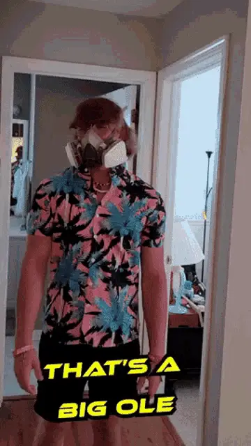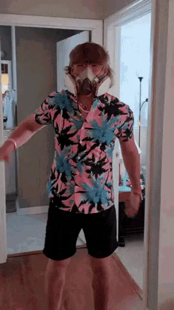 Luke Franklin doing a Jersey Shore fist pump while wearing a gas mask and Hawaiian shirt.