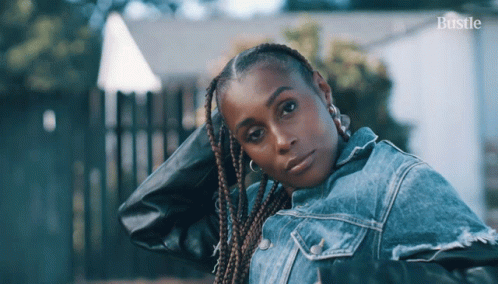 Issa Rae, wearing a denim jacket, poses for the camera, adjusting her braided hair and smiling.