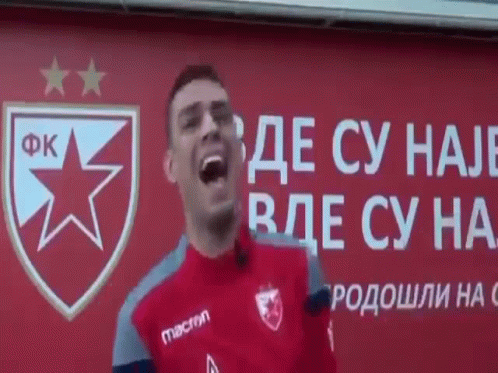 Fk Crvena Zvezda players share a laugh in front of the club's red wall with its logo.