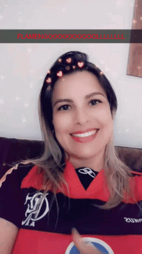 Eufê, wearing a Flamengo shirt, smiles brightly for the camera, celebrating her team.