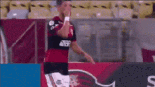 Arrascaeta, a Flamengo player, makes a gesture on the field during a 2019 match.