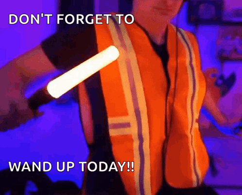 Dubblebubz in an orange vest with light wands, reminding viewers: 'Don't forget to wand up today!'