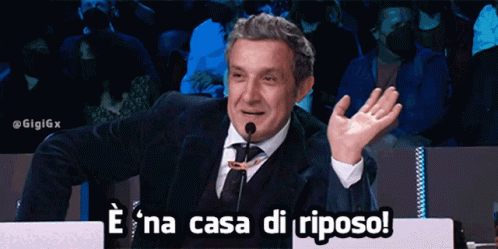Flavio Insinna humorously exclaims 'È 'na casa di riposo!' in a TV show setting, gesturing with a smile.