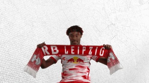 Mohamed Simakan proudly displays his RB Leipzig scarf, wearing the club's jersey.