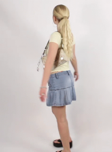 A woman models a Y2K-inspired outfit featuring platform flip-flops, a denim mini-skirt, and a 'Movedora' t-shirt.