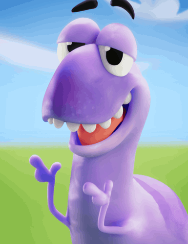 a purple cartoon character is giving a thumbs up with a blue sky in the background