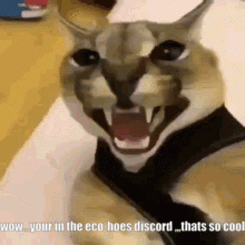 Floppa the caracal cat reacts with wide-eyed surprise to being in the 'eco-hoes discord'.