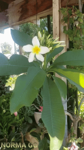 A beautiful white plumeria flower with a vibrant yellow center, surrounded by lush green leaves, with 'NORMA GG' visible.