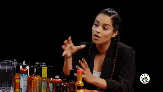 Florence Pugh points to her face in a close-up shot, likely from a First We Feast interview.