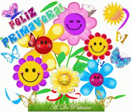 A vibrant graphic celebrating 'Feliz Primavera' with colorful flowers, smiley faces, a bright sun, and butterflies.