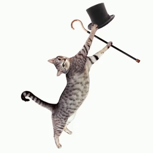 Floreyonce Kitty, a charming cat, stands on its hind legs holding a miniature top hat and cane.