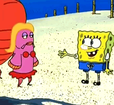 Floreyonce, a pink fish with blonde hair, kicks a spiky Spongebob Squarepants on a sandy beach.