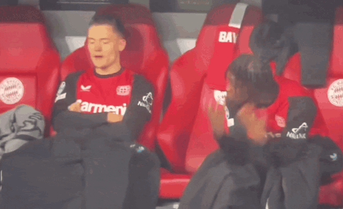 Florian Wirtz and Jeremie Frimpong react from the bench during a Bayer Leverkusen match.