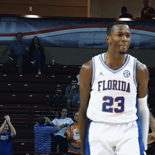 Scottie Lewis of the Florida Gators basketball team reacts on the court during a game.
