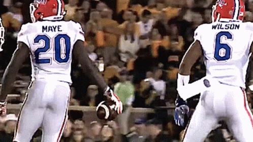Florida Gators football players Maie (#20) and Wilson (#6) on the field during an intense college football game.