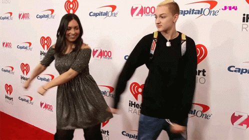 Backpack Kid (Russell Horning) and Emily Brozyna perform the Floss Dance on a red carpet.