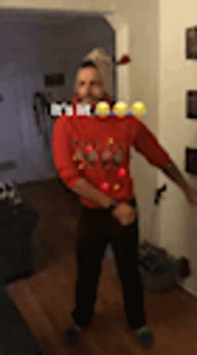 Man in a festive light-up Christmas sweater enthusiastically dances in a living room.
