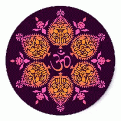 A vibrant purple and yellow mandala with an Om symbol at its center, adorned with floral patterns.