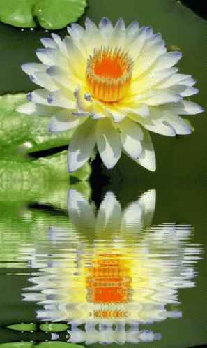 A stunning white and purple lotus flower with a vibrant orange center, perfectly reflected in rippling water.
