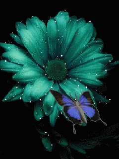 A vibrant purple flower sparkles with glitter as a delicate blue butterfly flutters nearby against a dark background.