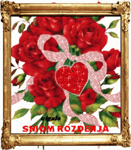 A framed picture of red and pink roses with a 'Happy Birthday' message, set in Lithuania.